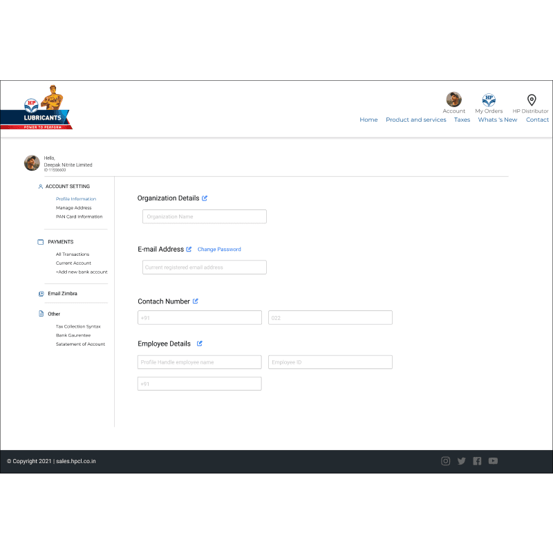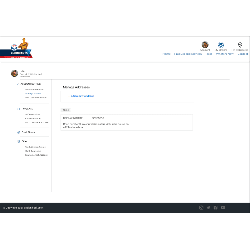 Contains all the necessary details along with 3 main subpages i.e Account,My Order & HP Distributors.