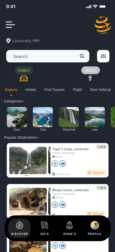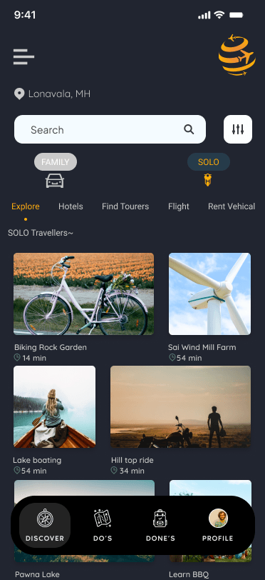 Landing page which will automatically detect location and show top 10 best location to visit also it will also give users an option to show family or solo mode view locations.