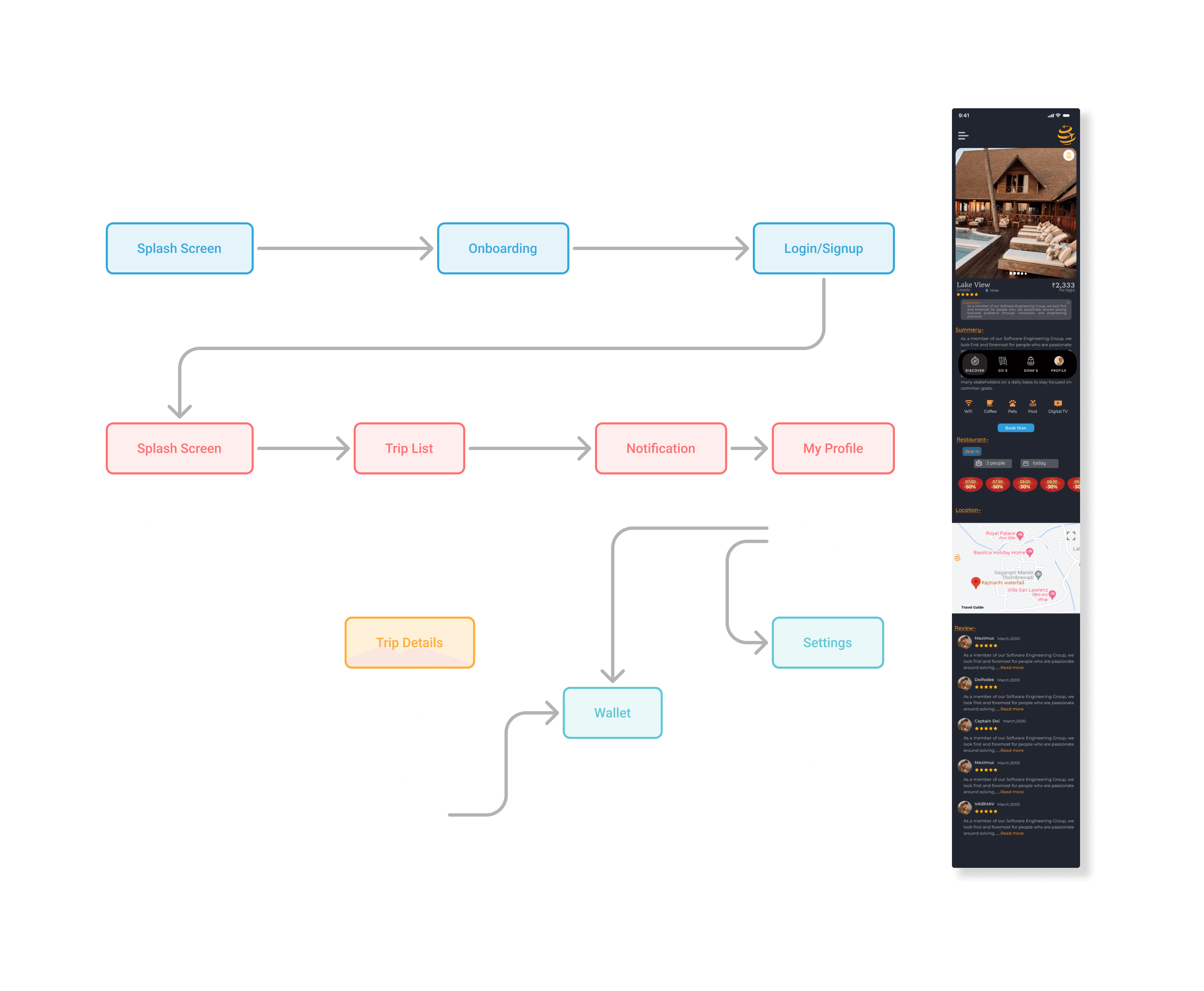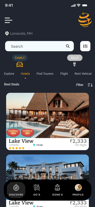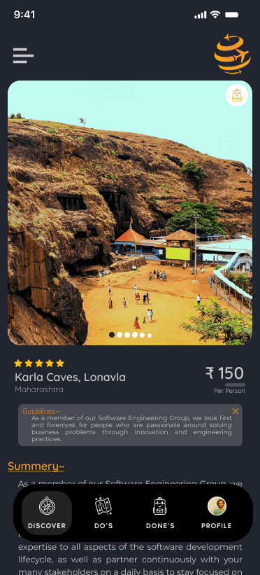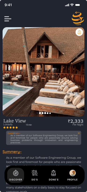 location view with page with essential details like entry fee,things to bring and dont covid restrictions for each destination and important protocols along with nearest hotels motels hostel according to family mode or solo mode. Additonal feaure of discount for user on perticular time.